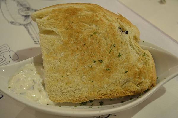 接著要送上好吃的 【 手工麵包 】,麵包烤得很酥香搭配的醬料跟生菜沙拉的蒜味凱薩醬很像耶~