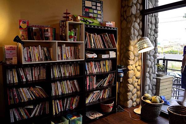 一進到阿喜店內就有這一個擺滿書的角落,感覺超舒服的,不過面向這面牆的身後就是一區人滿炸的用餐區了~~