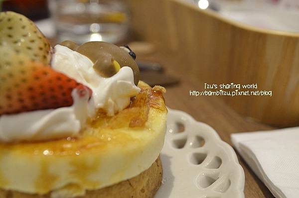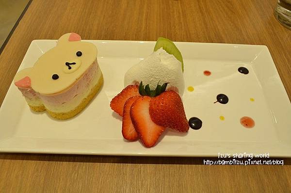 重點當然是這個小白熊起司草莓蛋糕摟!! 旁邊還有一顆草莓切片、一塊奇異果跟鮮奶油裝飾,